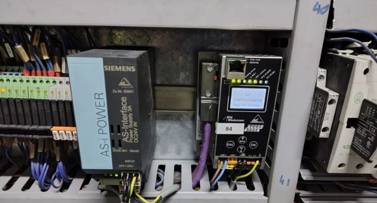 A máquina de produção operava com uma rede AS-i composta por módulos e gateway obsoletos, sem recursos modernos de diagnóstico